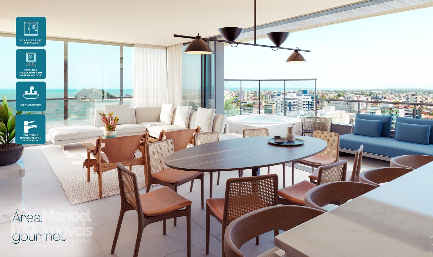 * Detalhes que Impressionam: Pé direito elevado, espelhos com desembaçador, box linha Luxo, áreas comuns equipadas com sofisticação, carregador para veículo elétrico, infraestrutura para automação e Wi-Fi, portões eletrônicos, circuito de segurança discreto, ponto para bicicleta elétrica, fechadura eletrônica de última geração, cuba esculpida e torneiras monocomando nos banheiros, caixa acoplada com acionamento duplo e medição individualizada.