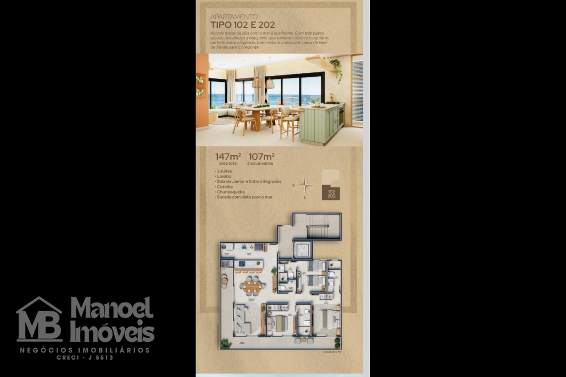 Este apartamento foi projetado para proporcionar conforto e bem-estar, com ambientes amplos e bem distribuídos. Destaque para a sala de estar integrada, a cozinha funcional e a sacada com churrasqueira e vista para o mar, ideal para momentos de convivência com família e amigos. Sua localização à beira-mar garante luz natural, ventilação e uma atmosfera única de litoral.