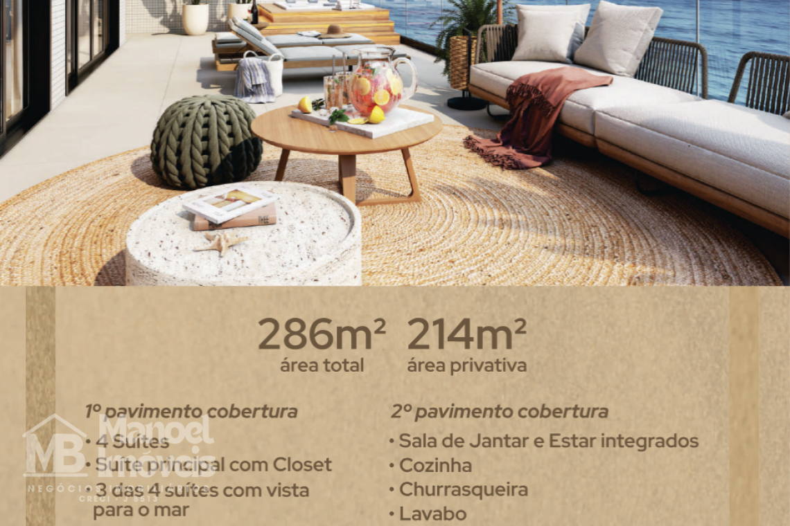 Este apartamento foi projetado para proporcionar conforto e bem-estar, com ambientes amplos e bem distribuídos. Destaque para a sala de estar integrada, a cozinha funcional e a sacada com churrasqueira e vista para o mar, ideal para momentos de convivência com família e amigos. Sua localização à beira-mar garante luz natural, ventilação e uma atmosfera única de litoral.